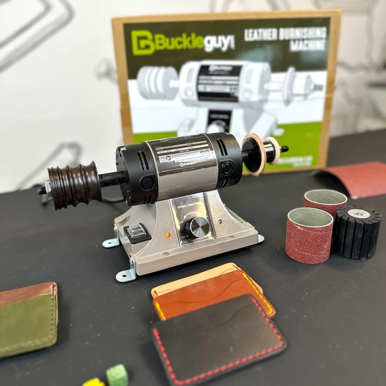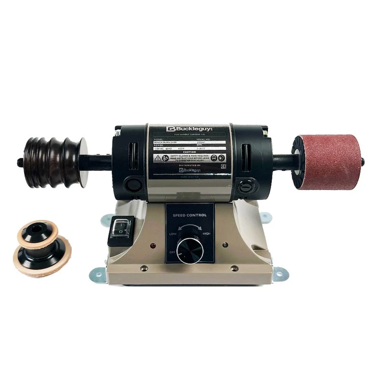 The BG 110V leather burnisher is a multi purpose tool found on nearly all leather work benches. It is designed for sanding, burnishing, and sharpening leather and leather working tools. It can also be used for other materials such as wood. The machine has three attachment accessories: sanding wheel, burnishing drum, and leather sharpening discs. The variable speed control allows you to throttle the speed to the appropriate degree based on need.