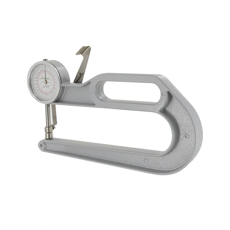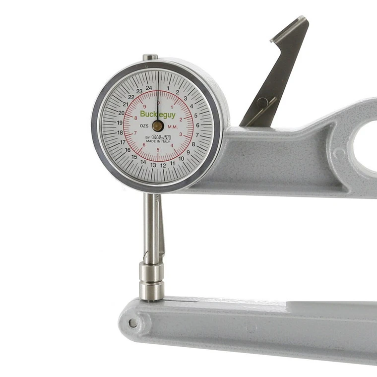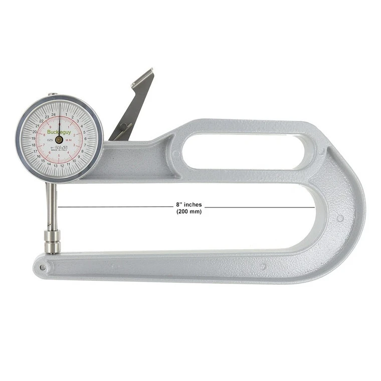 A leather measuring device capable of measuring up to 1.07″(27.13mm) thickness with an 8″ throat.