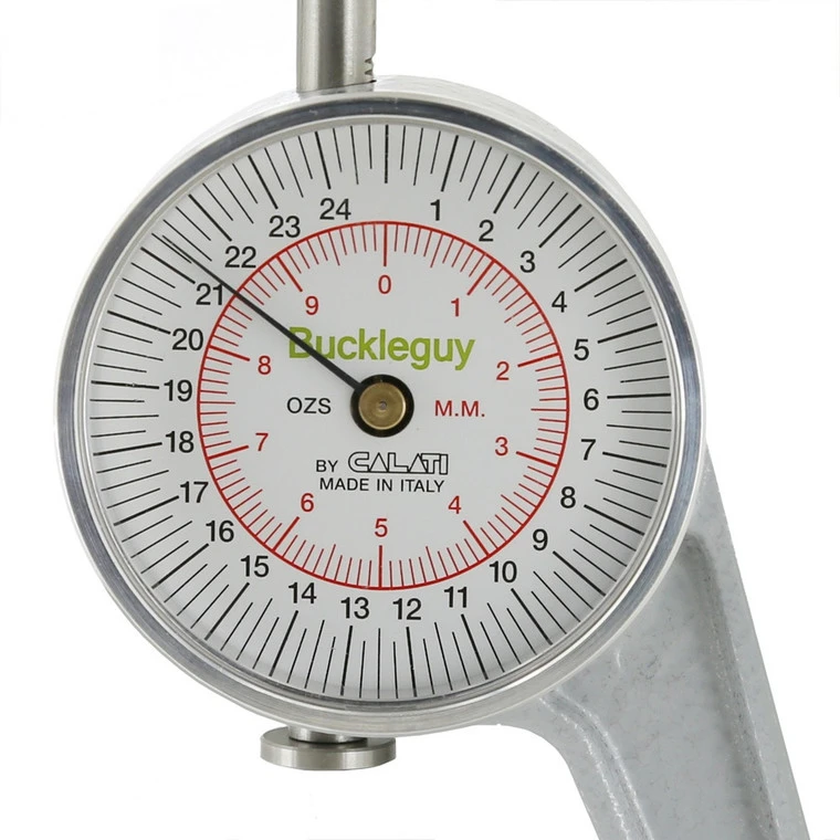 A leather measuring device capable of measuring up to 3/4″ thickness with a 1 1/2″ throat.