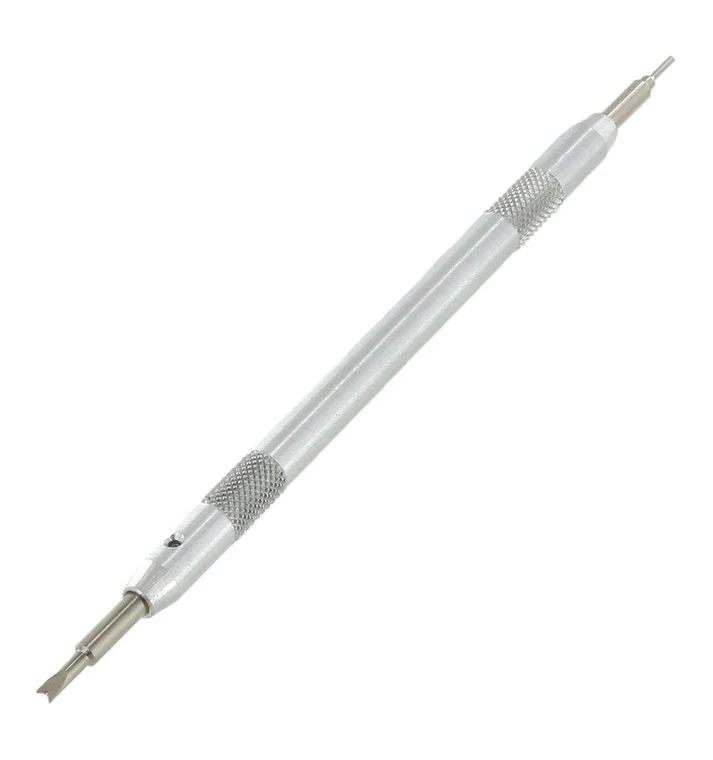 The forked end of this tool is used for compressing the spring bars without damaging the watch strap.
